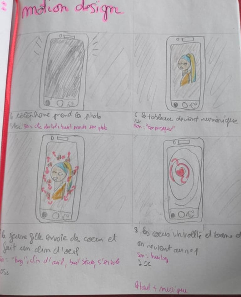 Après avoir appris les bases du motion design, nous avons participé au Motion Design Contest, un concours inter-écoles dont le thème était Art et digital. Pour construire mon projet, j’ai d’abord listé les mots associés à l’art et au digital, puis combiné ces idées afin de trouver un sous-thème. Après une première piste écartée, j’ai choisi d’illustrer la rencontre entre les œuvres d’art et le téléphone.