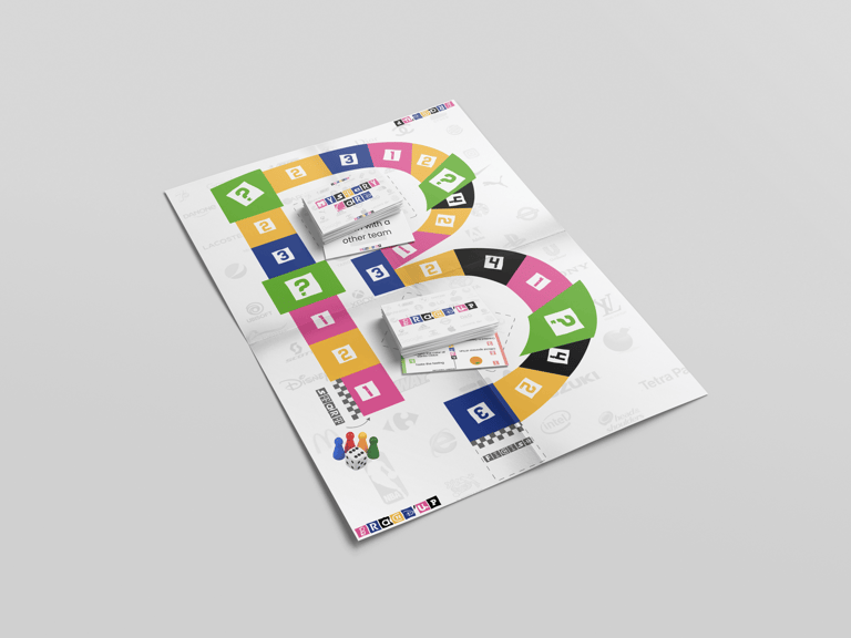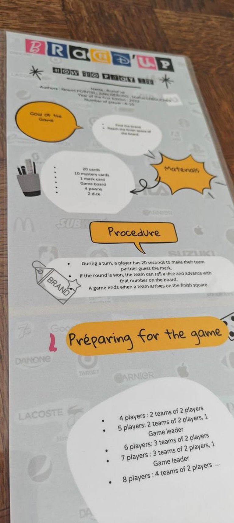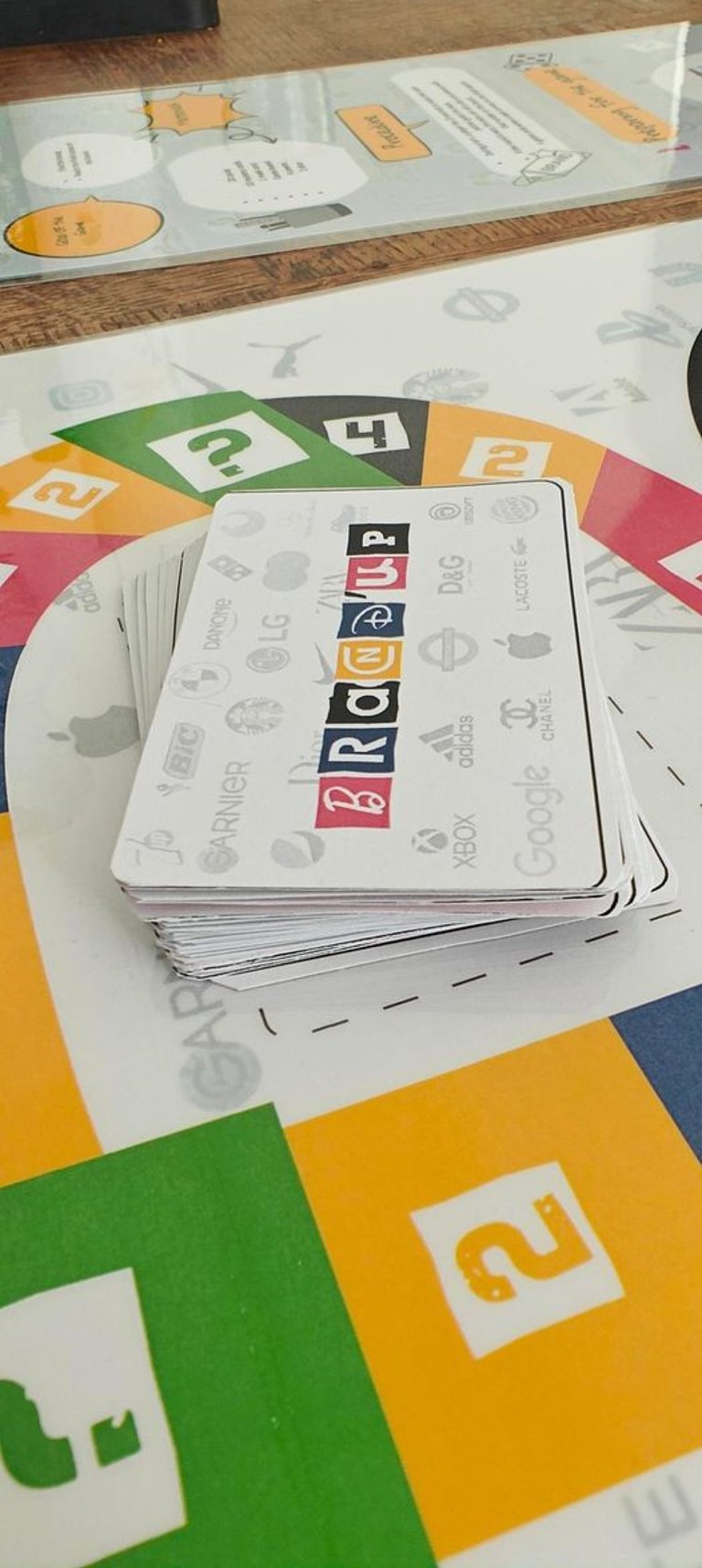 Dans le cadre de l'English Game qui dure une semaine, nous avons conçu en groupe inter-spécialités un jeu de société en anglais autour du web. Après avoir testé des jeux d’anciens étudiants, nous avons choisi de créer Brand’up, un jeu de plateau sur la culture des marques.