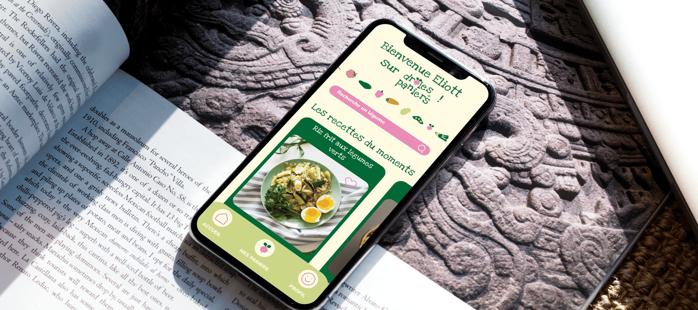 Dans le cadre d’un module en UI/UX, par groupe de deux, nous avons imaginé une application mobile sur le thème de l’inflation. Nous avons décidé de faire sur l'alimentaire en proposant la vente de paniers de légumes « moches » moins chère, car moins choisis. L’expérience démarre par des recettes simples, réalisées à partir des légumes disponibles dans nos paniers.
