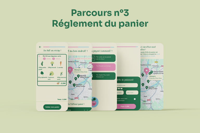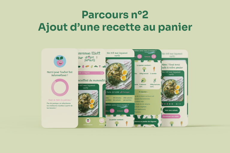 Je me suis plus particulièrement occupée de la direction artistique et de la réalisation de plusieurs maquettes clés : écran de chargement, accueil, recettes, panier (le deuxième parcours ) et le parcourt achat.